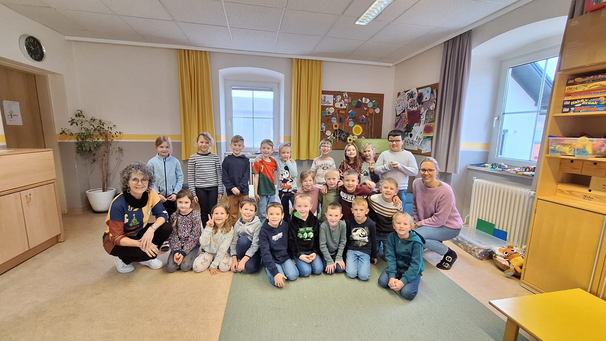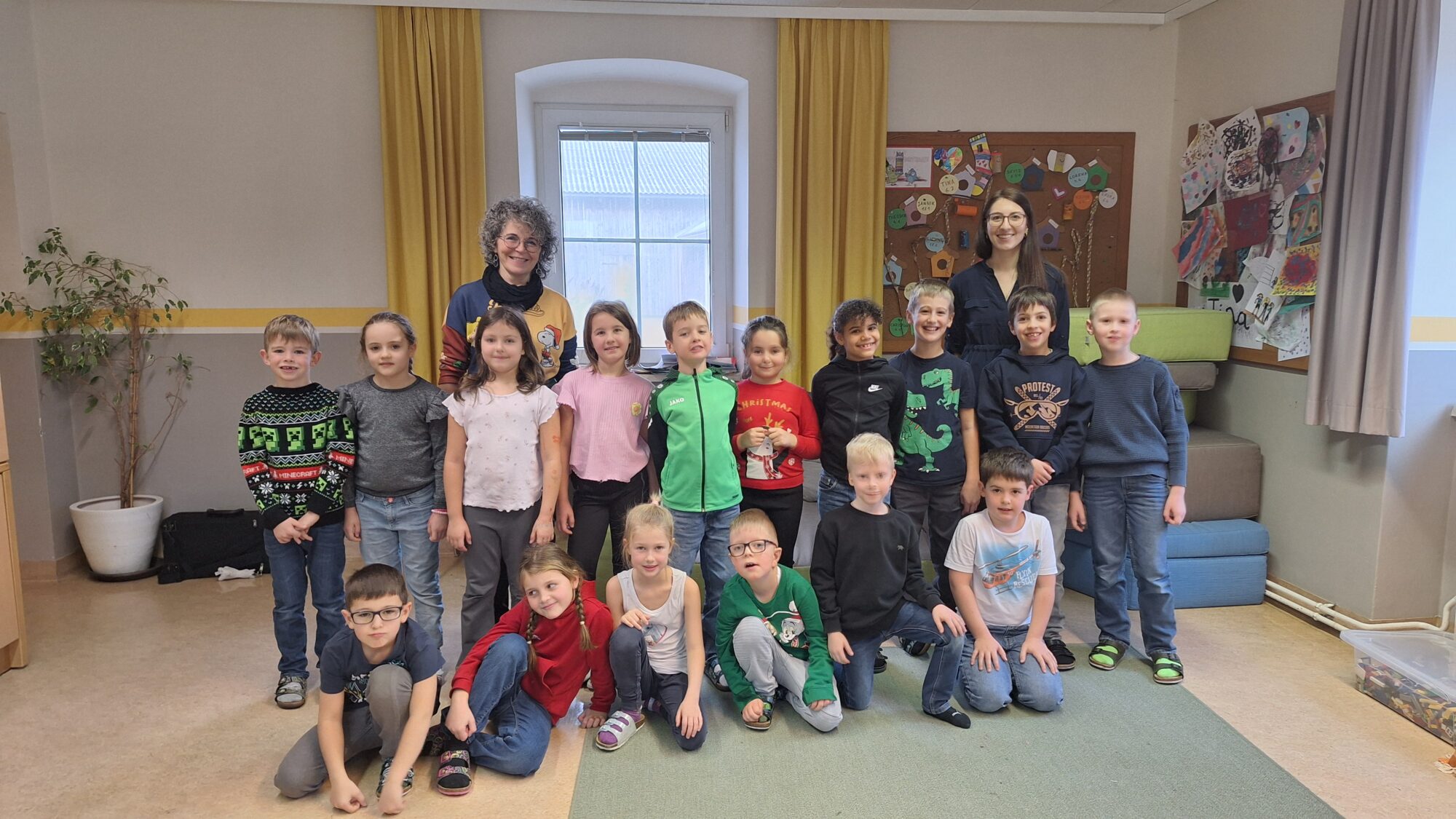 Auf diesem Foto sieht man zwei erwachsene Personen und Kinder einer Schulklasse